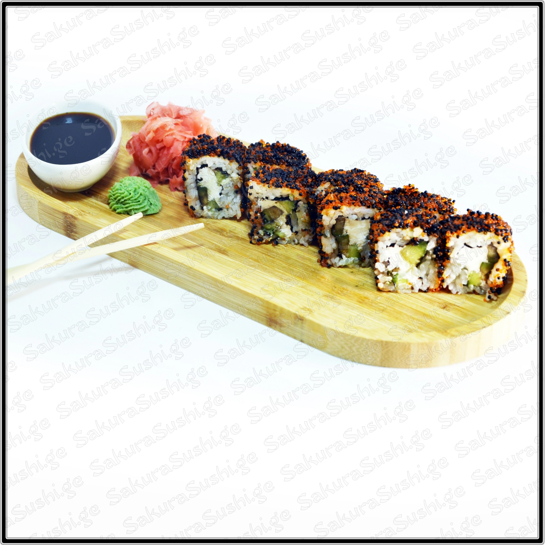 COMPONENTS: Nori, Rice, Cream Cheese, Avocado, Red And Black Tobiko.